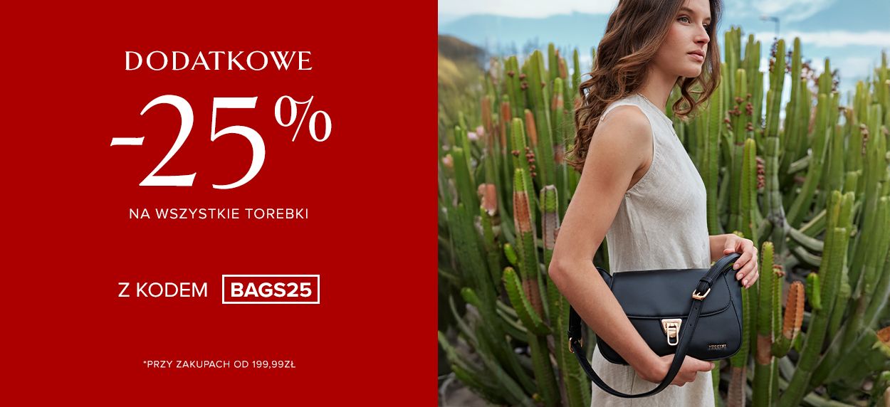- Produkty objęte promocją znajdują się w kategorii Torebki Damskie i oznaczone sa labelką -25% z kodem BAGS25